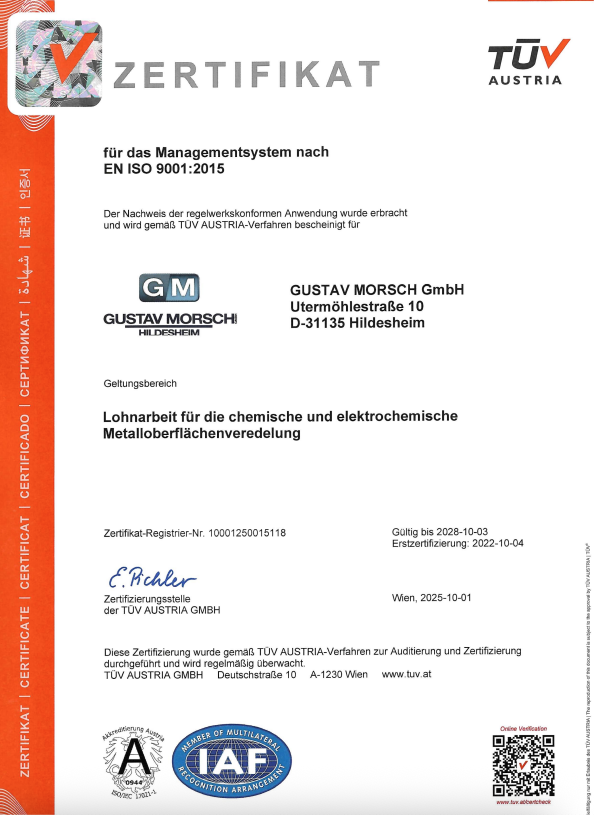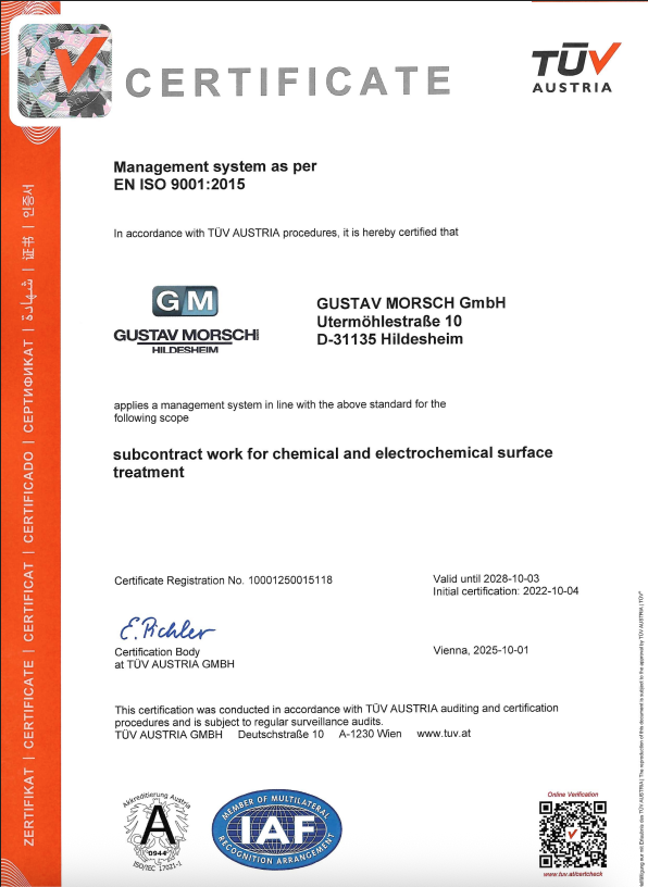 Unser Unternehmen ist in den Bereichen Qualität, Umweltschutz und Arbeits- und Gesundheitsschutz nach den Normen DIN EN ISO 9001:2015, DIN EN ISO 14001:2015, sowie nach DIN ISO 45001:2023 für die Geltungsbereiche Edelstahlbeizerei und Industrieverpackungen zertifiziert.